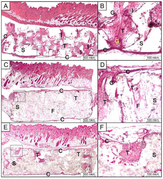 Micrographs of H&E-stained tissue sections from the subcutaneous implantation area in group 1 (PLA) (A,B), group 2 (PLA/HA 15%) (C,D), and group 3 (PLA/HA 20%) (E,F) after 14 days of implantation. S—scaffold; C,T—connective tissue; F—collagen fibers; I—inflammatory infiltrates; G—giant multinucleated cell. (Reproduced with the permission from the publisher, reference [162]).