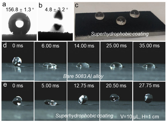 (a) CA image, (b) SA image, (c) optical image of water droplets placed on the coated sample, dynamic water droplet impact process on (d) bare 5083 Al alloy, and (e) superhydrophobic coating.