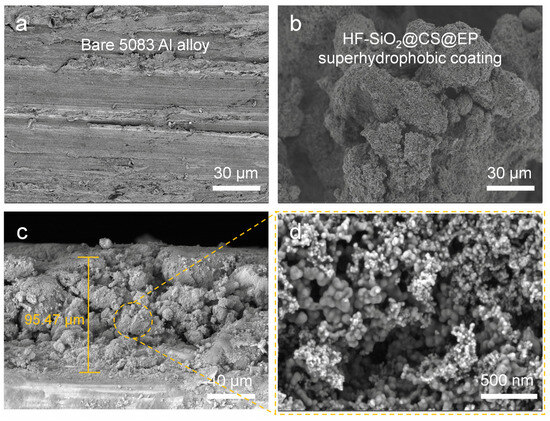 FE-SEM images of (a) bare 5083 Al alloy and (b) superhydrophobic coating; (c,d) cross-section SEM images of superhydrophobic coating.