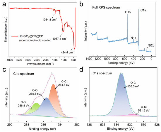 (a) FTIR spectra, (b) full XPS spectra, and high-resolution (c) C1s and (d) O1s spectra of the HF-SiO2@CS@EP superhydrophobic coating.