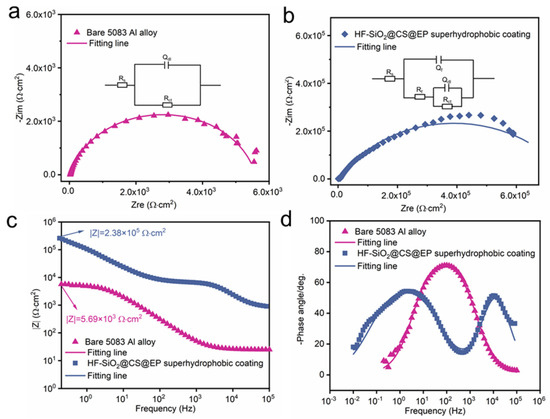 Nyquist plots of (a) bare 5083 Al alloy and (b) superhydrophobic coating-protected Al alloy. Bode plots of (c) frequency vs. modulus and (d) frequency vs. -phase angle.