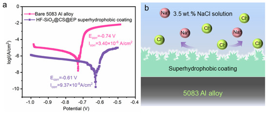 (a) Potentiodynamic polarization curves of the bare 5083 Al alloy and superhydrophobic coating-protected substrate. (b) Anti-corrosion mechanism of the superhydrophobic corrosion-resistant behaviors.