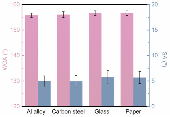 Furthermore, to demonstrate the advantages of the coating’s applicability on different substrates, we prepared coatings not only on Al alloy but also on carbon steel, glass, paper, and various other substrates. The superhydrophobic properties of the coatings were evaluated through CA and SA measurements on the different substrates. Figure 9 presents the CA and SA data for the coatings on various substrates, showing that the CAs were all greater than 155° and the SAs were all less than 7°, indicating excellent superhydrophobic characteristics across different substrates. This confirms that the coating system developed in this study can be effectively applied using spraying techniques across a wide range of substrates. Coupled with its low cost and efficient production, the developed spraying method for superhydrophobic coatings holds promise as a reliable and functional protective material alternative for various materials across different industries.