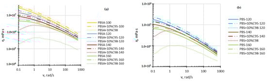 Dynamic viscosity η of PBSA (a) and PBS (b) composites with C98 and C95 chitosan additives as a function of frequency v at 100 °C, 120 °C, 140 °C and 160 °C.