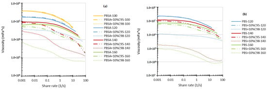 Melt rheology measurements were conducted over a certain temperature range to estimate the processing conditions of the obtained thermoplastic compositions. Consequently, further rheological investigations in rotation and oscillation at 1% shear strain modes were performed within 100–160 °C for PBSA and 120–160 °C for PBS matrix composites in compliance with the melting behavior of both biopolymers (maximum melting temperature of PBS and PBSA are 117 °C and 89 °C, respectively).