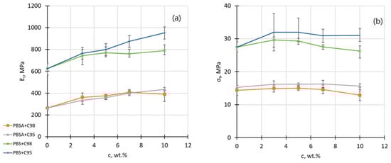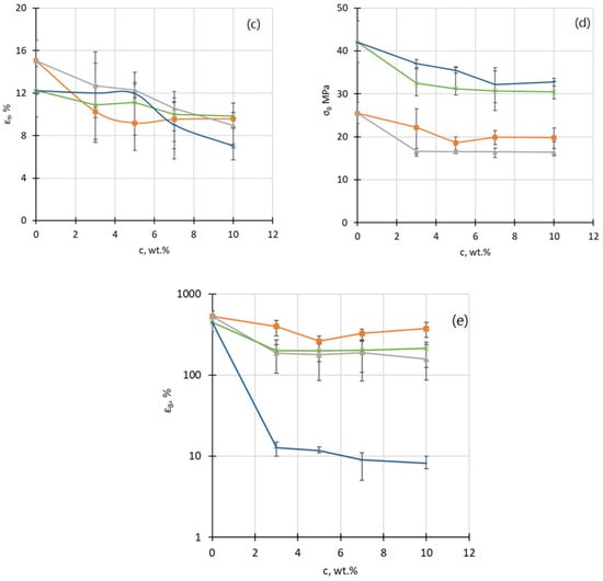 In Figure 3a–e, the compositional relationships of tensile modulus Et, yield strength σY, yield strain εY, strength at break σB and strain at break εB and the chitosan additive content c of the developed PBS and PBSA composites are demonstrated. As already expected, the addition of rigid chitosan filler causes the elastic modulus of the composites to increase, demonstrating non-linear behavior with a gradual saturation at higher chitosan concentrations. In general, higher modulus values (by the factor 2–2.5) are demonstrated by the systems based on PBS due to a higher rigidity of its macromolecular chain, whereas a somewhat larger total increment of the modulus value is observed in the case of C95-containing systems, most probably due to its higher molecular mass. Thus, at a 10% concentration of C95 in PBS, the modulus increased by ca 50% from 624 MPa to 951 MPa.