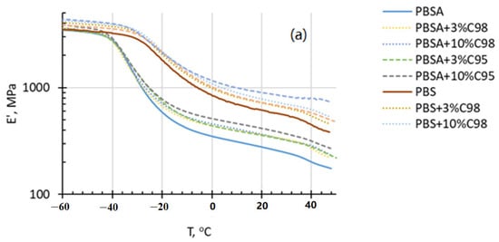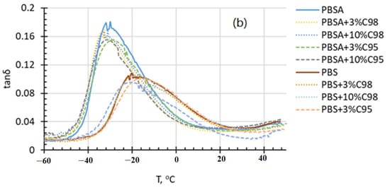 Figure 4 demonstrates viscoelastic behavior (storage modulus E’ and loss tangent tanδ temperature T relationships) of the developed PBS and PBSA composites over the broad temperature range. In compliance with the tensile test results, chitosan, especially higher-molecular-weight C95, positively contributes to the stiffness of the composites, revealing the modulus increase below and above the glass transition region of the respective polymer matrix. It is also clearly visible that the chitosan addition promoted the shift of the dynamic modulus–temperature E(T) relationships towards the direction of higher temperatures, especially for PBS and C95-containing composites revealing a stiffening effect of the rigid chitosan filler on the polymer matrix. Increments of the modulus decrease over the ca 30 °C may be associated with the relaxation of the so-called rigid amorphous phase. Apart from this, the observed main modulus decrease within the temperature region between ca −50 °C and ca 0 °C for PBSA-based systems, as well as between ca −30 °C and +20 °C for PBS-based systems, is associated with the glass transition of the polymer matrix phase.