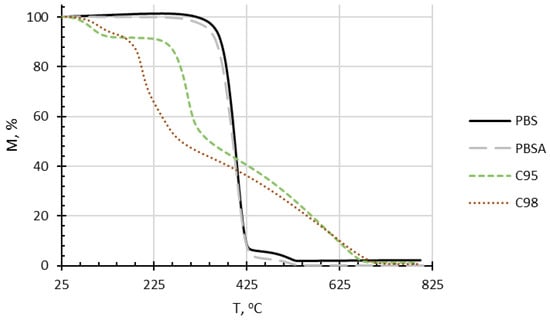 The thermooxidative stability of the composites primarily depends on the constituents’ chemical structure. As depicted in Figure 5 and Figure 6, PBS and PBSA degraded in two stages, whereas C95 and C98-in three stages. For chitosan, the first step in the weight loss curve is commonly related to the evaporation of water. In the case of C98, the first stage is broader than C95, and this is probably most connected with the beginning of thermooxidative decomposition of the chitosan oligosaccharide, as it was also observed in DSC thermograms. C95 has higher molecular mass and its thermooxidative decomposition starts after ca 225 °C. The 2nd weight loss stage of chitosan has been related with the dehydration of saccharide rings, as well as the depolymerization and decomposition of the acetylated and deacetylated units of the polymer, thus also depending on the degree of deacetylation of the biopolymer [44]. Consequently, C98 oligosaccharide with lower molecular weight demonstrated a more prominent 2nd weight loss stage in comparison to C95. The 3rd weight loss stage of both biopolymers is associated with further degradation of the thermooxidation products of stage 1 and stage 2. In comparison to the chitosan additives, PBSA and PBS demonstrate considerable higher thermooxidative stability, resulting in the beginning of rapid weight loss beyond ca 300 °C. Comparatively, the thermogravimetric curve of PBSA is slightly shifted to the direction of lower temperatures as well as results in a lower residual mass. This is evidently related to a lower thermal stability of the incorporated adipate units in comparison to succinate.