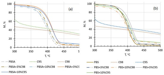 Thermogravimetric curves of PBSA (a) and PBS (b) composites with C95 and C98 chitosan additives as a function of temperature.