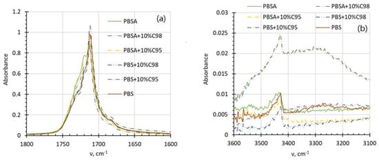 FTIR spectra of PBSA and PBS composites with C95 and C98 chitosan additives at carboxyl (a) and hydroxyl (b) absorption ranges.