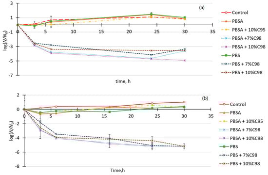 A supply of PBSA or PBS with 7 or 10% of fungal origin chitosan oligosaccharide (C98) resulted in a sharp decrease in CFU for both E. coli and S. cerevisiae in the first 6 h of treatment. A maximum reduction of 4.7 log E. coli CFU was obtained after a 24 h incubation on PBSA with 10% C98 (Figure 8a). The reduction in C98 to 7% in the composites resulted in only a minor decrease in efficacy (4.7 vs. 4.6 log after 24 h); however, a potential regrowth or resuscitation after 30 h of incubation was observed in these samples. The same trend was observed irrespective of the used polymer matrices. The observed phenomenon should be investigated further, if the polymer materials are intended for long-term storage.