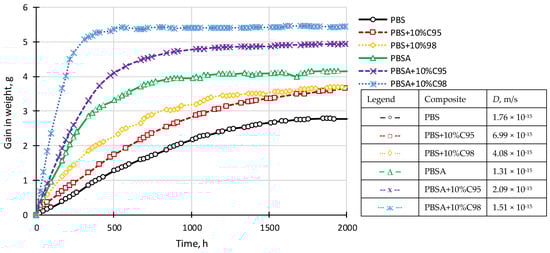 By considering potential applications of the developed composites for food packaging, water vapor permeability characteristics were analyzed. The water vapor sorption kinetic curves of the neat polymer matrices and its composites with the highest chitosan filler content are displayed in Figure 9. In general, the PBSA-based composites demonstrate higher water vapor sorption in comparison to PBS-based counterparts, which is explained by a more rigid macromolecular structure of the latter, as well as its denser crystalline structure. Furthermore, the influence of the C98 chitosan on the sorption behavior of the polymer is higher because of its larger water solubility in comparison to C95. Consequently, in the presence of the chitosan additive, the water vapor diffusion coefficient D increases as depicted in Figure 9. By considering the fact that increased moisture vapor diffusion may be disadvantageous for some packaging applications, further modification of the PBS and PBSA composites with organically modified nanoclay is expected.