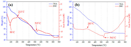 Figure 1 shows the TGA and DSC curves of 0ZBG and 6ZBG powder. As shown by the TGA curve (the blue line) of 0ZBG powder (Figure 1a), apparent weight loss can be observed with increasing temperatures. Basically, it can be roughly divided into two regions according to the slope of the TGA curve. An obviously continuous decrease in weight (49.0%) can be observed from room temperature up to 535 °C, whereas only 3.3% weight loss was exhibited thereafter. The transition can be better revealed by the DSC curve (the red line) in Figure 1a. An endothermic peak caused by residual water was observed at 90 °C. An exothermic peak was observed at 213 °C that can be attributed to the decomposition of the functional groups used during the process. Another endothermic peak at 535 °C was perceived due to the removal of nitrate. This shows a similar trend as reported in the literature [29,30]. Figure 1b shows the TGA and DSC curves for 6 wt.% zinc added in bioactive glass powder (6ZBG). The corresponding weight losses at the first and second regions were respectively 44.5 and 2.9 wt.% and were slightly smaller than those of 0ZBG powder. The endothermic peak at 90 °C, however, was almost absent. This was probably due to the relatively small amount of physically absorbed water in 6ZBG (~3.8%, weight loss up to 100 °C) compared to that of 0ZBG (6.5%) and the presence of Zn ions that hindered the water decomposition. The subsequent exothermic and endothermic peaks shifted to 263 and 543 °C, respectively. The addition of zinc slightly delayed the reaction to a higher temperature, but basically resulted in a behavior similar to that of 0ZBG. As revealed by TGA results, limited weight loss (less than 1 wt.%) can be observed after 700 °C and this temperature was used for the subsequent calcination of the sol–gelled powder.