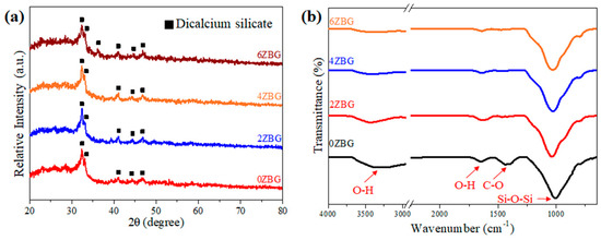 Figure 2 shows the SEM images of the BG and ZBG powder that was prepared via the sol–gel process, followed by its calcination at 700 °C for 3 h. Severe agglomeration can be observed for all the powders investigated in the present study. The agglomerated particles exhibited a particle size less than 1 μm. The crystalline structure of the ZBG powder was examined using XRD and FTIR techniques. Figure 3a shows the XRD patterns of ZBG powder that exhibited crystalline peaks of dicalcium silicate (β-Ca2SiO4, PDF No. 01-077-409) [10,31] with an amorphous phase background. Similar FTIR spectra were also observed for all the ZBG powders. The bands at 998, 1419 and 1635 cm−1 were attributed to Si-O-Si, C-O and O-H functional groups, respectively. In addition, there was a wide OH stretching vibration band around 3200–3600 cm−1.