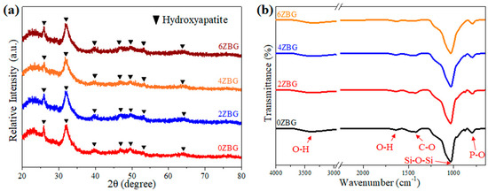 (a) XRD patterns and (b) FTIR spectra for 0ZBG-6ZBG powders after immersion in SBF solution for 7 days.