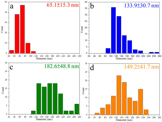 Diameter distributions of electrospun fibers with (a) 0, (b) 0.6, (c) 0.8 and (d) 1.0 g of bioactive glass powder additions.