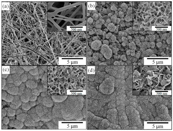 Electrospun PCL/ZBG bioscaffolds with different amounts of zinc addition (0ZBG-6ZBG) looked similar and the major difference was the amount of zinc addition. Thus, ES-0ZBG bioscaffolds were used as a prototype and Figure 8 shows the SEM images of them before and after their immersion in SBF solution for various durations. Figure 8a shows the as-prepared ES-0ZBG bioscaffold at a relatively low magnification. The insert image used a higher magnification, but it was slightly lower than that shown in Figure 6c (please note the differences in scale bars). After immersion in SBF for 1 day, cauliflower-like particles formed on the electrospun PCL/ZBG fibers (Figure 8b). As shown in the insert image with a higher magnification, coral-like HA particles can be observed and are similar to those shown in Figure 4 for ZBG powder. As shown in Figure 8c, no electrospun fibers can be observed and the cauliflower-like particles grew larger after their immersion in SBF for 3 days. The continuous growth of the cauliflower-like particles and the diminishment of pores were observed after immersing them for 7 days, as seen in Figure 8d.