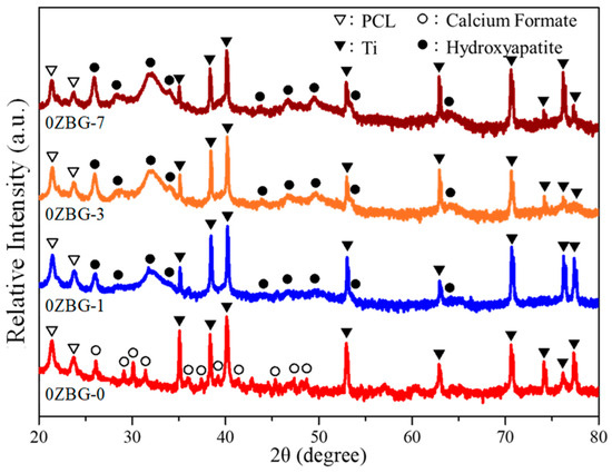 In order to elucidate the structure of the precipitated particles after SBF immersion, X-ray diffraction examination was performed and Figure 9 shows the corresponding XRD patterns. It can be noted that, in addition to the diffraction peaks from the Ti substrate, PCL and calcium formate (PDF No. 26-0937) can be observed before immersion. The diffraction peaks of calcium formate disappeared after immersion and those of HA were exhibited. The intensity of the HA diffraction peaks increased with the increasing immersion time. The results indicated that the continuous formation of hydroxyl apatite occurred during the SBF immersion [33].