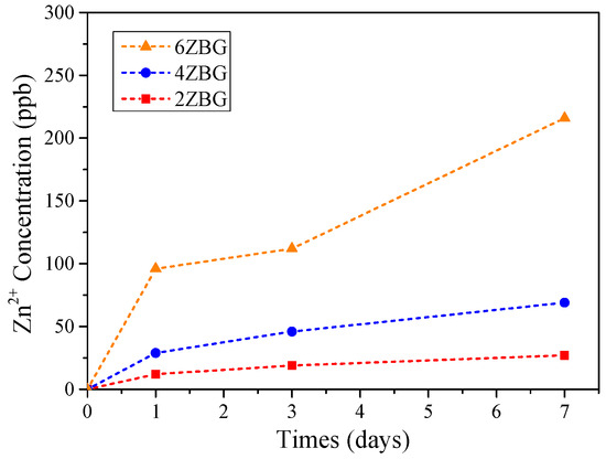 For the various electrospun PCL/ZBG bioscaffolds, the concentration of the Zn2+ ion will be an important issue for antibacterial performance [34]. As shown in Figure 10, it is obvious that the Zn2+ concentration increased not only with the Zn addition in ES-ZBG, but also with the immersion time. At the end of the 7 days of SBF immersion, the Zn2+ concentration was 27, 69 and 216 ppb in the residual SBF solutions for ES-2ZBG, -4ZBG and -6ZBG, respectively. This suggests that the electrospun PCL/ZBG bioscaffold with Zn addition may exhibit antibacterial ability in addition to their superior bioactivity. It has been reported by Oh et al. [35] that zinc-added bioactive glass exhibited, not only the antibacterial ability, but also ALP activity. However, the high concentration of the zinc-doped bioactive glass may induce cytotoxicity and inhibit bone regeneration [36]. Further investigations concerning the bone regeneration using the PCL/ZBG bioscaffolds are in progress and will be addressed elsewhere.