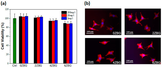 The biocompatibility of various concentrations of extracts from ES-ZBG in (a) murine fibroblast L929 cells and (b) the cell morphology and cytoskeleton integrity of L929 cells. Please note that the ES-ZBG bioscaffolds were abbreviated as ZBG in the figures, respectively.