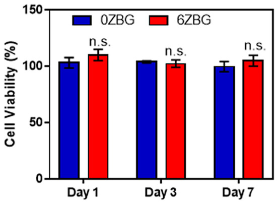 The long-term biocompatibility effects of ES-0ZBG and ES-6ZBG in MG-63 human osteoblast-like cells. ES-0ZBG and ES-6ZBG were abbreviated as 0ZBG and 6ZBG, respectively. No significant differences between 0ZBG and 6ZBG are abbreviated as “n.s.” in the figure.