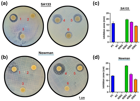The disk diffusion assay of various ES-ZBGs against two gram-positive S. aureus bacteria strains, (a) SA133 and (b) Newman. 1: P.C., 2: N.C., 3: 0ZBG, 4: 6ZBG, 5: 4ZBG and 6: 2ZBG. Corresponding inhibition zone diameters for those shown in (a,b) were measured and shown in (c) SA133 and (d) Newman, respectively.