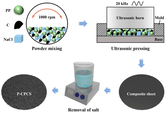 As shown in Figure 1, the preparation process of P-CPCS consisted of three main stages. (1) Powder mixing. PP powder, carbon flakes, and NaCl powder were mixed in different proportions. (2) Ultrasonic pressing (UP). A mold cavity was filled with the mixed powder, and ultrasonic pressing was initiated. The high-frequency vibrations of the ultrasonic horn provided viscoelastic and friction heat, which caused the PP powder to rapidly plasticize and melt [,,]. At the same time, the carbon flakes and salt powder were bonded together by the PP melt to form a sheet under the pressure of the ultrasonic horn. (3) Removal of salt. Each formed composite sheet was soaked in water for the removal of NaCl.