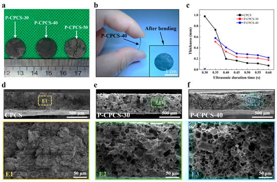 Formability and structural characteristics of P-CPCS. (a) Photographs of P-CPCS-30, P-CPCS-40, and P-CPCS-50. (b) P-CPCS-40 in bending state and after bending multiple times. (c) Variation in thickness of P-CPCS with ultrasonic duration time. Cross-section SEM images and magnified views of (d) CPCS, (e) P-CPCS-30, and (f) P-CPCS-40.