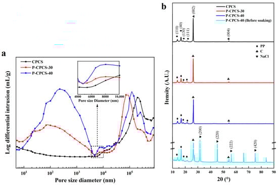 (a) Pore size distributions of CPCS, P-CPCS-30, and P-CPCS-40 and (b) XRD patterns.