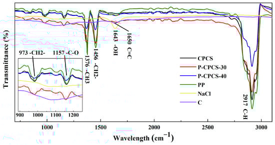 The cross-sectional morphologies of CPCS, P-CPCS-30, and P-CPCS-40 are displayed in Figure 2d–f. CPCS does not show the presence of any significant pores, while many pores can be observed in P-CPCS-30 and P-CPCS-40. Moreover, P-CPCS-40 has more pores than P-CPCS-30. These pores are uniformly distributed in the P-CPCS-30 and P-CPCS-40 composite sheets, providing a good basis for water path connectivity. The porosities of CPCS, P-CPCS-30, and P-CPCS-40 were respectively determined to be 22.09%, 36.52%, and 46.39% according to mercury intrusion. The pore distributions shown in Figure 3a indicate that the difference in porosity among CPCS, P-CPCS-30, and P-CPCS-40 is mainly in the pore size range of 0.01–10 μm. Within this pore size range, P-CPCS-40 has significantly more pores than P-CPCS-30, while P-CPCS-30 has significantly more pores than CPCS. Apparently, there are micron pores and nanopores in both P-CPCS-30 and P-CPCS-40. The micron pores were mainly formed by the dissolution of micron-scale NaCl particles and agglomerates of multiple NaCl particles in water. The nanopores were formed in three ways. In the first, nanopores are formed by the dissolution of small amounts of nanoscale NaCl particles. In the second, nanopores are produced when the PP melt is unable to completely cover the surface of the NaCl particles or the carbon flakes. In the last, nanopores are left behind when the PP melt cannot completely fill the gaps created by the mutual support of the NaCl particles and the carbon flakes. The latter two ways are the main reasons for the formation of a large number of nanopores in P-CPCS-30 and P-CPCS-40. The XRD pattern of P-CPCS-40 before soaking clearly shows the characteristic peaks of NaCl at 31.77°, 45.54°, 56.60°, and 75.47°, as displayed in Figure 3b []. However, these characteristic peaks do not appear in the XRD patterns of the P-CPCS-30 and P-CPCS-40 samples after soaking, indicating that NaCl is completely removed from the composite sheets via soaking in water. This further demonstrates the establishment of internal and external connected water paths in P-CPCS-30 and P-CPCS-40. As shown in Figure 4, the FTIR characteristic peaks of the raw PP mainly include 2917 cm−1, 1456 cm−1, 1376 cm−1, 1157 cm−1, and 973 cm−1 [], and the carbon flakes are characterized by a peak of 1650 cm−1 []. It is clear that CPCS, P-CPCS-30, and P-CPCS-40 have the same characteristic peaks, which demonstrates that the chemical composition and vibrational structure of PP have not changed during the fabrication process of the composite sheet. P-CPCS-30 and P-CPCS-40 This further indicates that the porous structure is mainly constructed through the adhesion and mutual support of PP and carbon flakes.