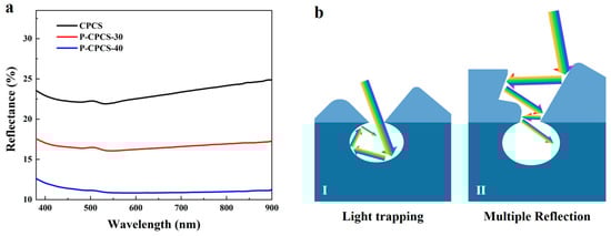 The reflectances of CPCS, P-CPCS-30, and P-CPCS-40 were measured in the visible-NIR wavelength range (380–900 nm) to study their optical properties, as shown in Figure 5a. Due to their porous structures, P-CPCS-30 and P-CPCS-40 show notably lower visible-NIR reflectance than CPCS. P-CPCS-40 has the lowest reflectance (close to 10%), which is attributed to its higher porosity compared to P-CPCS-30. These results indicate that light absorption is enhanced by greater porosity. Figure 5b schematically illustrates the light-trapping effect of this porous structure. On the one hand, the incident light that hits P-CPCS is trapped within the pores, leading to repeated reflections until complete light absorption is achieved. On the other hand, the rough and multi-dimensional structural surface of P-CPCS is also capable of inducing multiple reflections [], which not only increases the optical path length but also improves the chance of light being trapped by the pores. Together, these factors mean that P-CPCS has excellent light absorption.