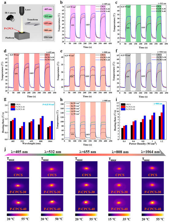 P-CPCS photothermal conversion evaluation. (a) Schematic diagram showing the photothermal conversion experiment. Temperature curves of samples under (b) 405 nm, (c) 532 nm, (d) 655 nm, (e) 808 nm, and (f) 1064 nm laser irradiation at a power density of 0.25 W/cm2. (g) Heating rates of the samples irradiated by 405, 532, 655, 808, and 1064 nm lasers at a power density of 0.25 W/cm2. (h) Temperature curves of P-CPCS-40 irradiated by 808 nm laser at power densities of 0.4, 0.6, 0.8, 1.0, and 1.2 W/cm2. (i) Heating rates of samples irradiated under 808 nm laser at different power densities. (j) IR images of CPCS, P-CPCS-30, and P-CPCS-40 irradiated by 405, 532, 655, 808, and 1064 nm lasers at a power density of 0.25 W/cm2.