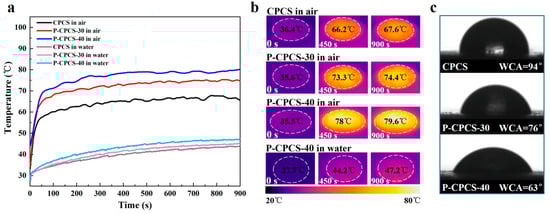 Due to its internal and external connected water paths and excellent photothermal conversion performance, P-CPCS offers excellent potential for application in solar steam generation. Therefore, to evaluate the photothermal conversion properties of P-CPCS under solar irradiation, the temperature changes of CPCS, P-CPCS-30, and P-CPCS-40 under 1 kW·m−2 solar irradiation were determined in water and air. Photothermal conversion performance in water was evaluated by completely immersing each sample under the water near the water surface. Figure 7a shows that P-CPCS exhibits a notably higher change in temperature than CPCS in both air and water. The IR images shown in Figure 7b provide a more intuitive view of the temperature changes obtained over a 900 s period under 1 kW·m−2 solar irradiation. P-CPCS-40 in air experiences a rise in temperature to 79.6 °C, while P-CPCS-40 in water shows a rise in temperature to 47.2 °C. The obtained temperature rises of 44.1 and 19.5 °C indicate that P-CPCS has outstanding photothermal conversion performance under solar irradiation. As shown in Figure 7c, the WCA of CPCS is 94°, while the WCAs of P-CPCS-30 and P-CPCS-40 are 76° and 63°, respectively. This indicates that the porous structure of P-CPCS improves its hydrophilicity, which facilitates the infiltration of the water around P-CPCS into its interior and upper surface. This water is then heated and evaporated under irradiation.