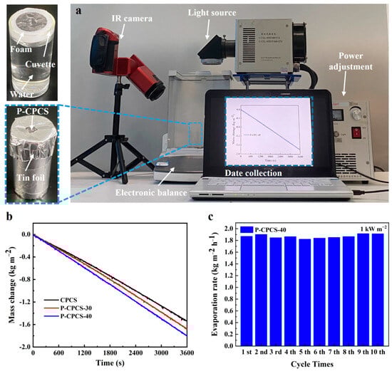 Evaporation performance of P-CPCS. (a) Physical image of the experimental setup for the solar-driven water evaporation experiment. (b) Changes in water mass achieved by CPCS, P-CPCS-30, and P-CPCS-40 under 1 sun irradiation. (c) Evaporation rates of P-CPCS-40 under 1 sun irradiation for 10 cycles.