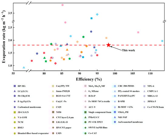 Comparison of evaporation rates and evaporation efficiencies reported for other absorber materials in previous studies.