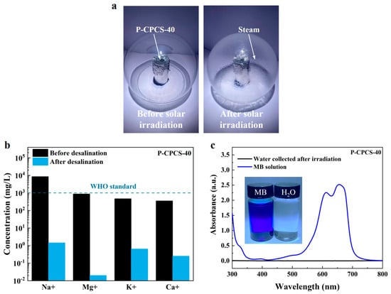 The desalination performance of P-CPCS when utilized for solar steam generation in seawater was investigated by performing evaporation experiments using simulated seawater instead of pure water and collecting the water after steam condensation. As shown in Figure 10a, the steam generation source (simulated seawater with P-CPCS-40 on the surface) was covered with glass under 1 sun irradiation. As a result, the steam evaporating from the P-CPCS-40 surface condensed on the inner glass surface. The concentrations of Na+, Mg2+, K+, and Ca2+ in the simulated seawater were measured before irradiation and in the water collected during the evaporation process, as indicated in Figure 10b. The ion concentrations of the water evaporated from the P-CPCS-40 surface are nearly three orders of magnitude lower than those of the simulated seawater. Moreover, these ion concentrations are significantly lower than the World Health Organization (WHO) drinking water standard. These results show the superb desalination performance of -CPCS.