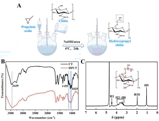 Firstly, the chitin powder was repeatedly frozen and thawed with a sodium hydroxide/urea system to obtain a transparent CT solution. Then, the CT solution was transferred to a three-port flask, 1,2-Epoxypropane was added dropwise at 4 °C and the reaction was stirred for 24 h. The hydrochloric acid solution was added to adjust its pH to neutral, and the purified product hydroxypropyl chitin (HPCT) was obtained by cryodialysis, centrifugation, and freeze-drying. Subsequently, HPCT was validated using the following detection methods.