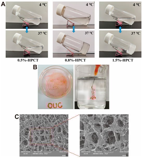 (A) Phase transition of HPCT hydrogels with different concentrations under vial tilting method. (B) Plasticity and injectability of HPCT hydrogel (0.8%). (C) Structural morphology of HPCT hydrogel under scanning electron microscope.