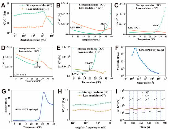 First, we carried out dynamic strain scanning of HPCT hydrogel (1%) in the range of 0.1%~1000% to determine the linear viscoelastic region (LVR) of the hydrogel. It was observed from Figure 3A that the hydrogel was stable within the range of 0.1% and 100% strain. To ensure that the measured data were meaningful, we chose a strain of 1% for subsequent testing.