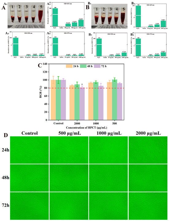 The hemocompatibility of HPCT on rabbit red blood cells was evaluated using different concentrations of HPCT aqueous solution. The results were shown in Figure 4A and Figure 4B. Neither the experimental concentrations of HPCT nor saline caused rupture of rat erythrocytes, whether the test was performed using whole blood or 2% erythrocytes. The hemolysis rate of test concentration of HPCT was less than 5%, which meets the requirements of the hemolysis rate of medical materials.