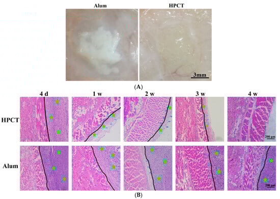 (A) The initial state of the alum and HPCT hydrogels after subcutaneous injection into rats. (B) H&E staining images at different times (the green pentagram areas are the subcutaneous residual material, the blue arrows show the approximate boundaries of residual material and tissue, and the black lines are the boundaries of the different areas).