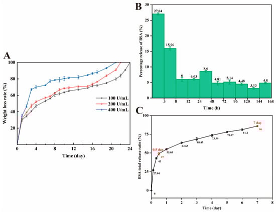 (A) The degradation curve of the HPCT hydrogel in different concentrations of lysozyme. (B) Percentage of BSA released in stages from the HPCT hydrogels (weight of BSA released per stage/total weight of BSA). (C) Total release rate for BSA from the HPCT hydrogel.