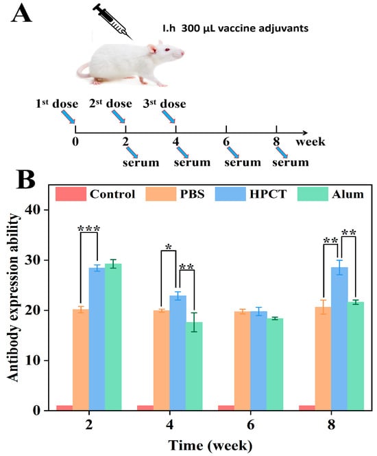 Mice, the classic model for immunological studies, have an immune system that shares many similarities with humans, and they are easy to raise and manipulate. Moreover, there is a relative abundance of immunohistochemical reagents, immunological tools, and reagents for mice, so we selected mice as the donor for this experiment. Female mice (6–8 weeks old, 8 mice per group) were divided into the HPCT hydrogel experimental group (with antigen), commercial alum group (with antigen), PBS group (with antigen), and saline group (without antigen, as a “control group”). The adjuvant–antigen mixture was configured as 40 μg of protein antigen per 100 μL of adjuvant. Each mouse was subcutaneously injected with 300 uL of the corresponding adjuvant–antigen mixture or saline on the back, and at days 14 and 28 after the initial immunization, the same dose and route were used for booster immunization for a total of 3 times. The time point of primary immunization was recorded as 0 week. Blood was taken from the orbit of mice at 0, 2, 4, 6, and 8 weeks, and serum was extracted for later use.