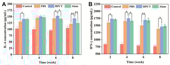 ELISA kits were used to detect the cytokines IL-4 and IFN-γ in the serum of mice, which were related to the level of immunity, to assess the immunization effect of the hydrogel adjuvant [32,33]. Combined with specific antibody expression levels, the effectiveness of HPCT hydrogels as adjuvants was comprehensively evaluated.