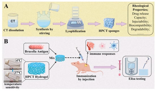 (A) HPCT preparation and characterization. (B) Hydrogel containing brucellosis antigen for immunization of mice.