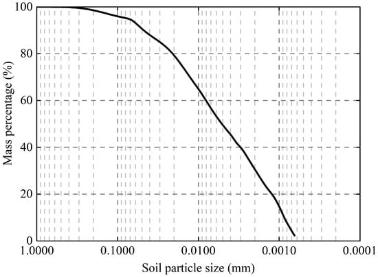 The soil used for the study was expansive soil taken from Henan Province, China. Based on the reference criteria in Table 1, the maximum dry density of the expansive soil was obtained as 1.858 g/cm3, and the optimum moisture content was 15.71%. The expansive soil has a liquid limit of 57.9% and a plastic limit of 22.3%, which was determined to be a high liquid limit clay (CH) according to the Unified Soil Classification System (USCS) [34]. The particle size of the expansive soil is shown in Figure 1, and the uniformity coefficient (Cu) is 9.3, which indicates a good gradation. The free swelling ratio of the expansive soil is 71% using the expansive soil classification method established by Prakash et al. [35], which indicates that the soil is a moderately expansive soil.