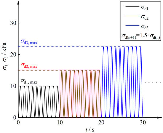In this study, dynamic triaxial tests were conducted on five rubber fiber-reinforced expansive soil samples exposed to 0, 1, 3, 6, and 10 freeze–thaw cycles (N). Wang et al. [44] indicated that freezing temperatures close to 0 °C may lead to incomplete freezing of the specimens. To avoid incomplete freezing of the samples, the specimens were frozen at −20 °C for 12 h and thawed at 20 °C for 12 h. The specimens were sealed with plastic wrap during freeze–thaw cycles to prevent moisture loss. A GDS dynamic/static triaxial instrument was employed for the test, and the dynamic stress loading process is shown in Figure 2. The dynamic stresses in this study are sinusoidal waveforms with a frequency of 1 Hz in order to simulate the dynamic loads imposed on the subgrades of heavy haul trains, and each level of dynamic stress contains 10 cycles [45]. The first level of dynamic stress amplitude is 10 kPa, and the next level of dynamic stress amplitude is 1.5 times the previous level.