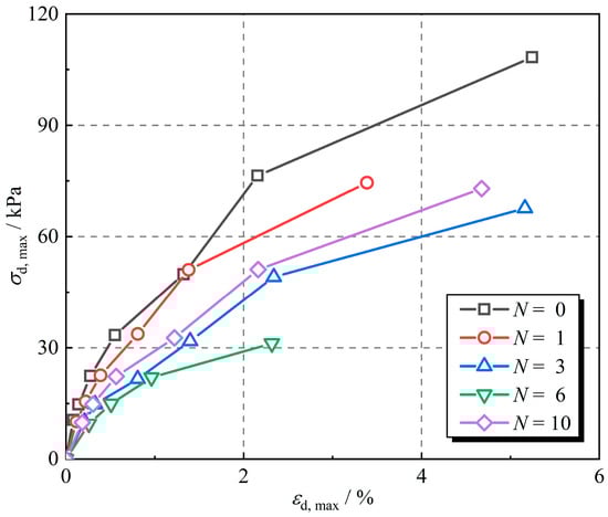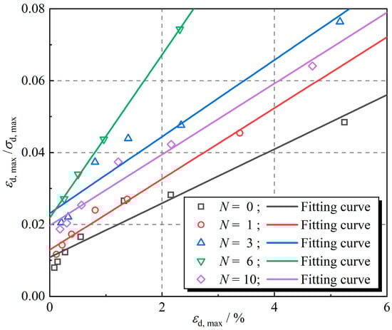 Equation (4) shows that and have a linear relationship. Figure 6 shows the − test results, which are linearly fitted to obtain the values of a and b. In Figure 6, the data points are the test results, and the straight lines are the fitted results. The ultimate dynamic stress and maximum dynamic elastic modulus of rubber fiber-reinforced expansive soil at different numbers of freeze–thaw cycles were obtained by Equation (3), and the results are displayed in Table 2.