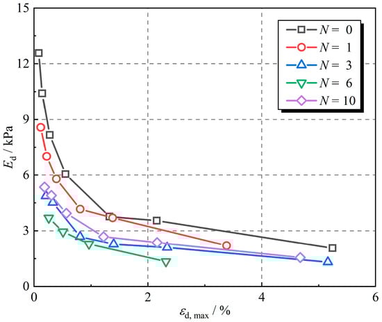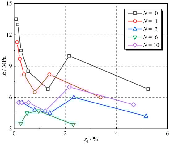 Figure 4 shows the dynamic elastic modulus of rubber fiber-reinforced expansive soil for different numbers of freeze–thaw cycles. The results show that the dynamic elastic modulus decreases gradually as the dynamic strain amplitude increases. The dynamic elastic modulus decreases more rapidly at lower dynamic strain amplitudes (the dynamic elastic modulus decreases sharply within the first 2% of the dynamic strain amplitude and decreases slowly after the dynamic strain amplitude exceeds 2%). Due to the presence of rubber, the reinforced expansive soil shows more elastic behavior at the beginning of loading; however, the soil particles rub against each other as the dynamic stress amplitude increases, and the reinforced expansive soil gradually transforms into plastic behavior; therefore, the dynamic elastic modulus of the rubber fiber-reinforced expansive soil exhibits the characteristics of Figure 4 [33]. The dynamic elastic modulus of the sample without freeze–thaw cycles was the largest. The dynamic elastic modulus declined by 15.5%, 46.3%, 52.2%, and 34.8% after 1, 3, 6, and 10 freeze–thaw cycles, respectively, when the dynamic strain amplitude was 1%, as compared to the sample without freeze–thaw cycles. It is the cracking of expansive soil under freeze–thaw cycles that leads to the decline in the dynamic elastic modulus of the specimens [46,47,48]. As the number of freeze–thaw cycles increases, the dynamic elastic modulus decreases and then increases, reaching the minimum value at the 6th freeze–thaw cycle.