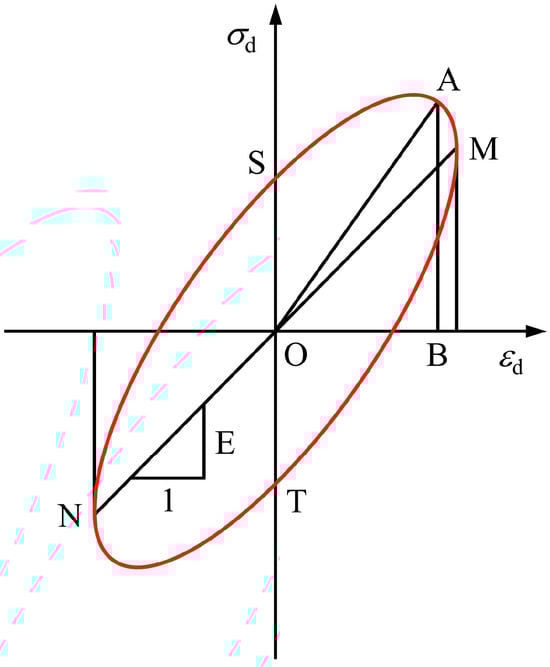 Figure 7 shows the hysteretic curve of the sample without freeze–thaw cycling at level 7 dynamic stress, which has a shape close to an ellipse. The elliptic hysteretic curve when the material is exposed to cyclic loading is shown in Figure 8, and the damping ratio can be calculated by the following Equation (5):